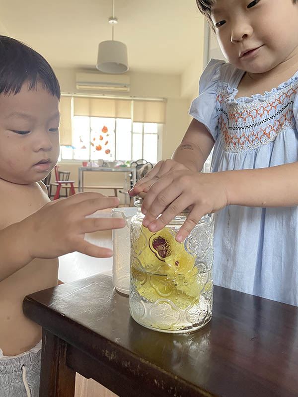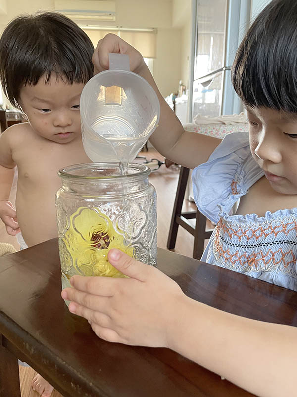 隨意沖洗一下放玻璃瓶+1小匙白糖。每天搖2次等待。氣泡其實到第3天才出現,第4天廚房分批來了好幾軍螞蟻讓我好疑惑。等到打開瓶蓋才發現好香超迷人。趕快把瓶子放在有放水的盆子裡隔絕螞蟻大人進攻。