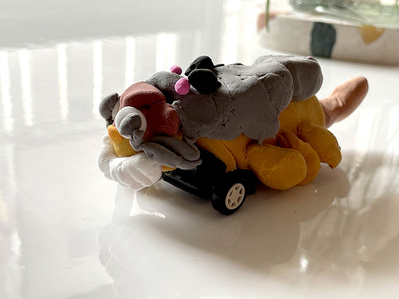 改造再利用 車車的箱子總會有幾台分屍的殘骸。昨晚發現了3台;其中剛好可以湊成2台 有些黏土沒有適合的顏色,所以隨便找一些混合一下。同時有位小先生很忙碌的在把所有黏土都堆疊上。 壞掉的車子重生